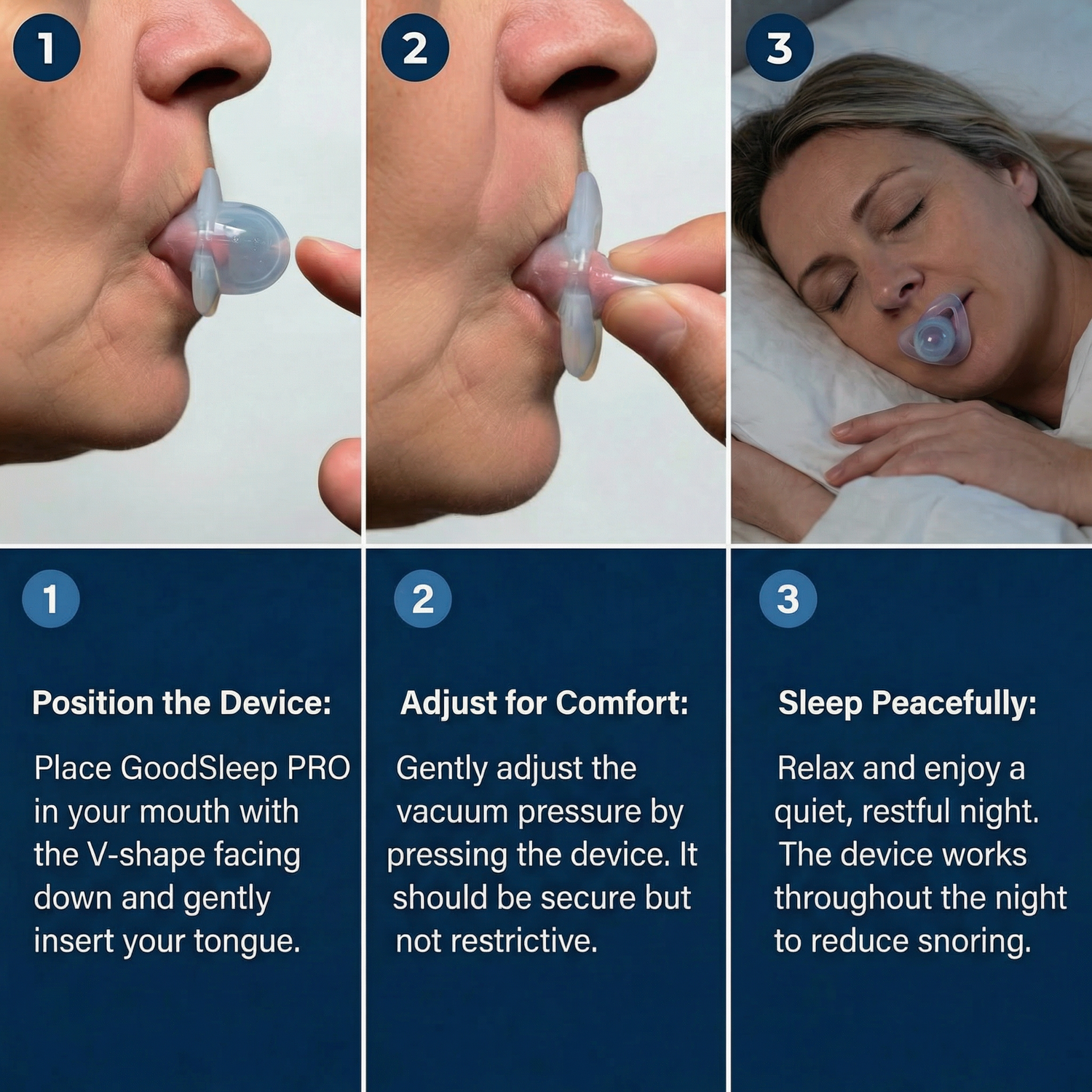 Place the soft silicone device on your tongue and gently squeeze to create light suction. It holds your tongue forward comfortably while you sleep.